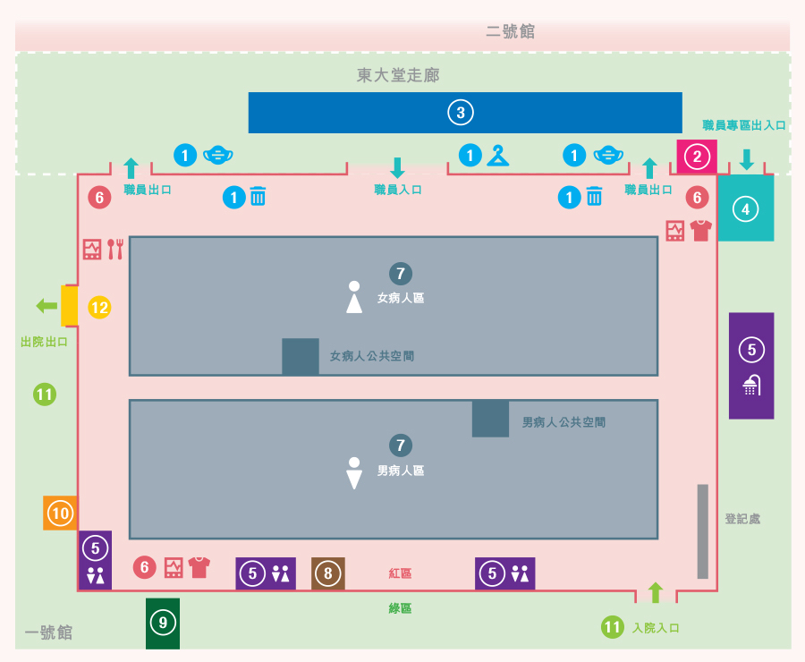 男女病人分隔在不同區域,男病人使用洗手間和淋浴間等設施不用經過女病人區。