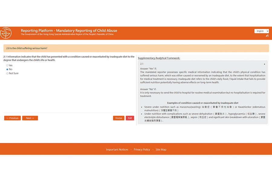 若不肯定個案是否達到強制舉報門檻,同事可參考社署電子輔助系統的決策流程圖及輔助分析框架。李醫生解釋:「虐兒可大致分為身體虐待、心理虐待、性侵犯和疏忽照顧,有各自的決策流程圖,疏忽照顧再分為四類。因此,共有七個決策流程圖並附有個案情境和解釋,同事可根據病童的最嚴重或最主要情況選取相應的決策流程圖。」一旦結果顯示須強制舉報,同事毋須再進行餘下的流程圖,而是直接在舉報平台,根據指示作書面報告。如參考流程圖後仍有疑問,可循適當臨床/保護兒童支援渠道徵詢意見;惟如已達法定門檻,應避免因諮詢而延誤舉報。
