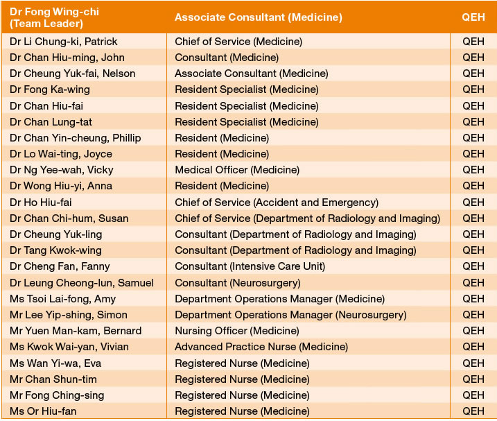 he Acute Stroke Thrombolysis team is a multi-disciplinary collaboration between the departments of Medicine, Accident and Emergency (A&E), Diagnostic Radiology and Imaging, Intensive Care Unit and Neurosurgery. They successfully overcame the challenges from the demand of an on-site neurologist and introduced the 24-hour intravenous stroke thrombolysis service in Queen Elizabeth Hospital (QEH).