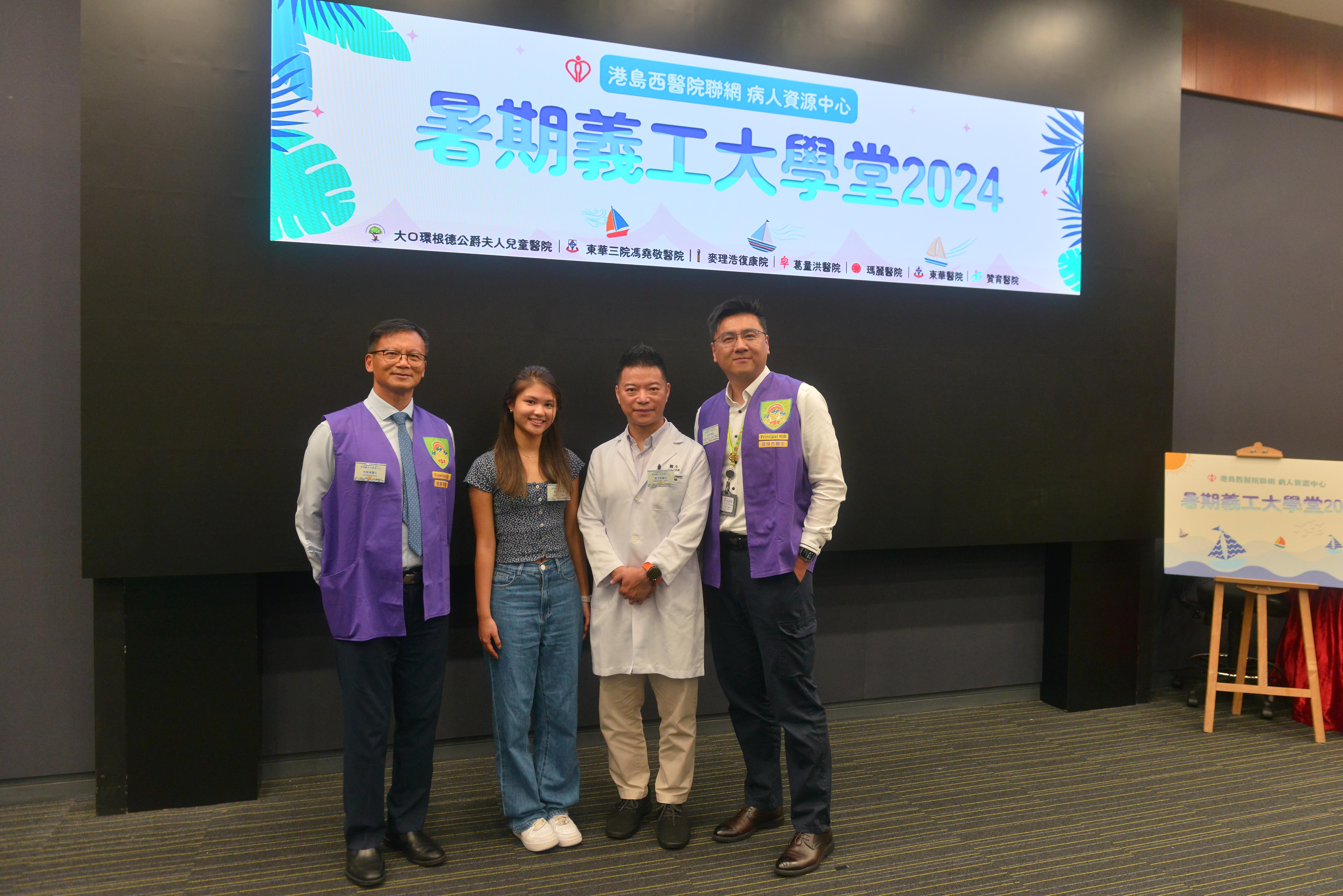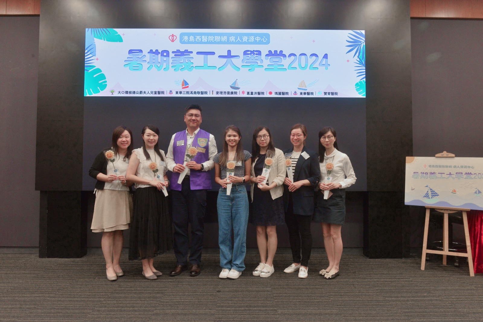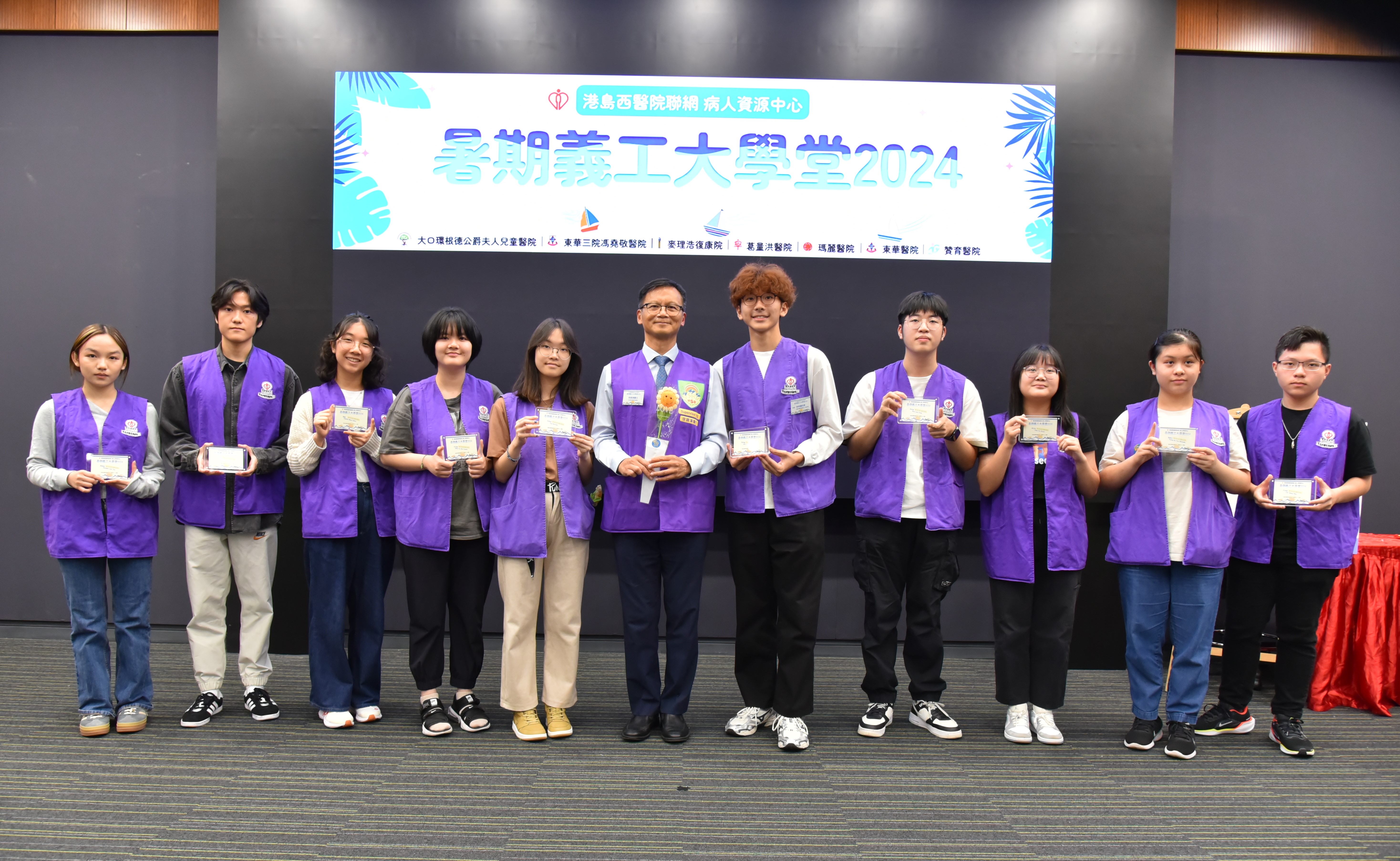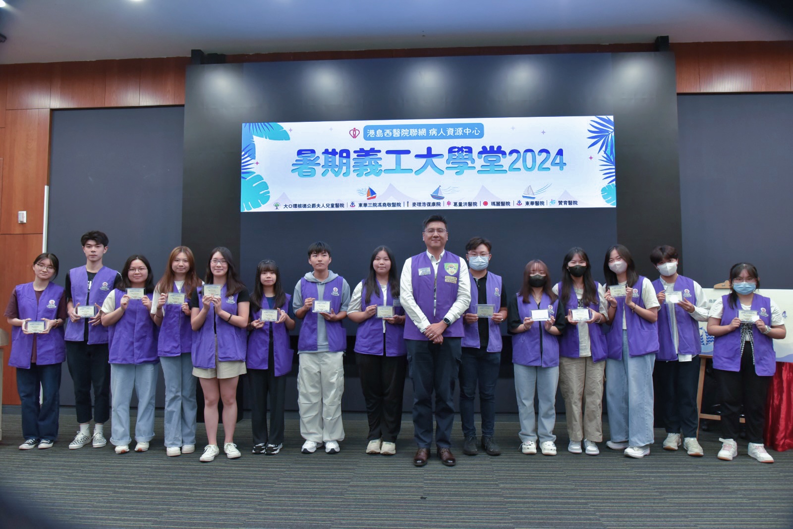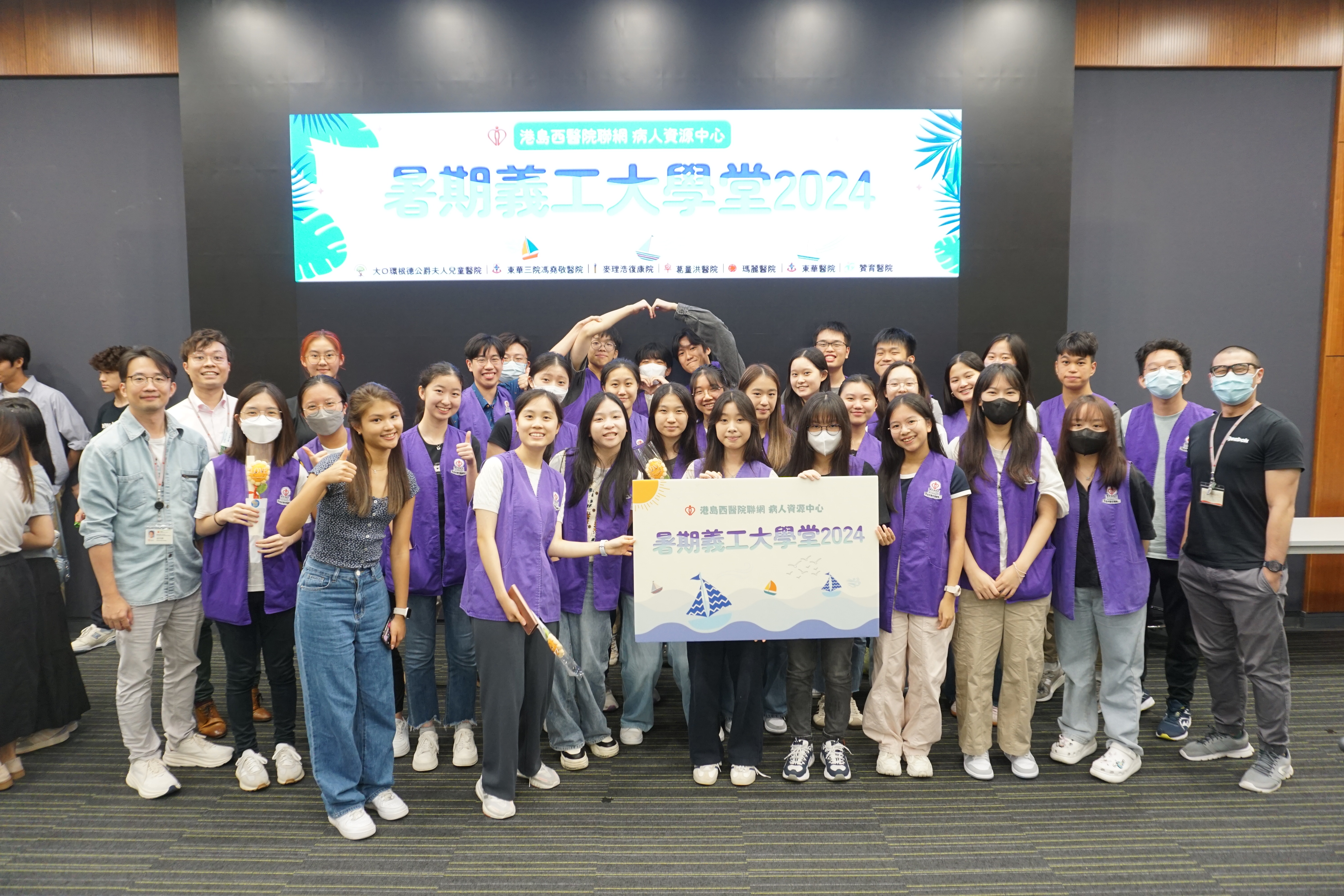 港島西醫院聯網病人資源中心每年舉辦暑期義工大學堂 – 學生健學生健康大使訓練及服務計劃。衷心祝賀超過120位學生義工已完成計劃,並為病人提供了超過5000小時的義工服務。希望學生義工在今夏所觀察到的、領悟到的,好好記在心上,逐一思索並回饋社會,實踐出暑期義工大學堂的重大理念-「讓年青人,從醫療角度,微觀社會,探索生命」。再次感謝各位義工的辛勤付出,你們的努力不僅造福了病人,也給醫院帶來了溫暖和關懷。
